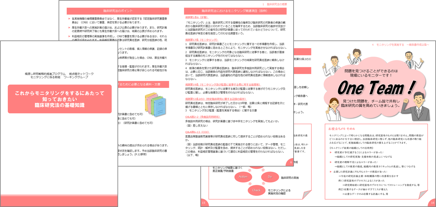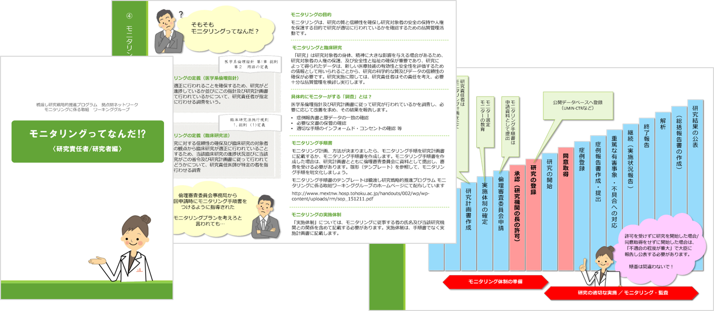モニタリングを実施する研究者、モニターとして初めて指名された方が主体的にモニタリングを実施できるよう、モニタリングの流れと基本事項を記載しています。